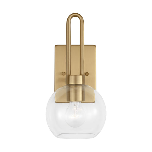The Codyn one light wall sconce in Satin Brass is a contemporary take on a classic mid-century design. Clear glass shades with open-ended spheres a...