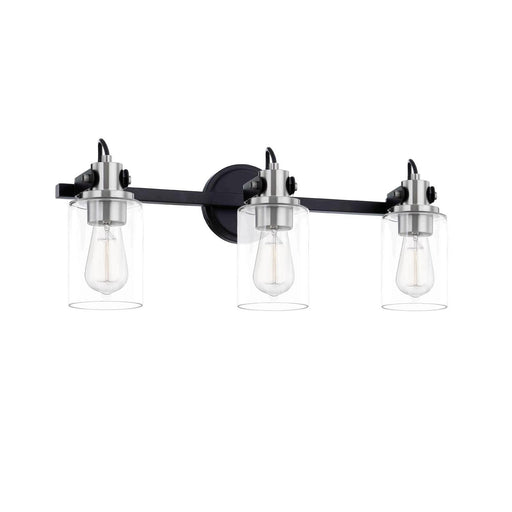 Details:Product Type: Three LightsFinish: Matte Black w/ Brushed NickelShade: Clear GlassMeasurements:Width / Dia: 23.50"Height: 9.00"Extension: 7....