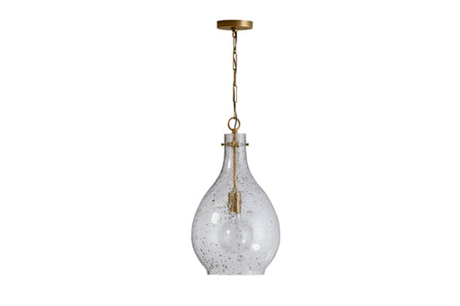 1 light pendant with Patinaed Brass finish and Stone Seeded glassDetails:Product Type: Glass DownFinish: Patinaed BrassShade: Stone SeededRooms: Ha...