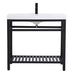 In true minimalistic spirit, this 36" vanity shines with pared down elegance. Bold clean lines build up the metal vanity, creating a modern simplicity that adds visual liveliness and complements any bathroom or powder room. The bottom shelf lets you put away any extra towels or bathroom essentials, and its shining white undermount sink creates contrast against the finish. Its bold graphic style will create a contemporary style in your home.