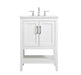 The nonchalant attitude of this 24" traditional white finish vanity will have you wanting more. The slender brushed nickel handle bars open the two cabinet doors to reveal ample storage space to put away and store bathroom essentials, and the open space below allows for you to place clean towels on the rack. Topped with a calacatta engineered marble countertop, you and your guests will enjoy this easy going vanity.