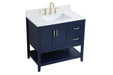 The nonchalant attitude of this 36" traditional Blue finish vanity will have you wanting more. The slender gold handle bars open the 3 cabinet doors to reveal ample storage space to put away and store bathroom essentials, and the open space below allows for you to place clean towels on the rack. Topped with a Calacatta engineered marble countertop, you and your guests will enjoy this easy going vanity. Comes with a matching backsplash to complete the look and protects your wall.