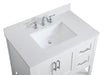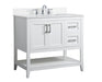 The nonchalant attitude of this 36" traditional white finish vanity will have you wanting more. The slender brushed nickel handle bars open the 3 cabinet doors to reveal ample storage space to put away and store bathroom essentials, and the open space below allows for you to place clean towels on the rack. Topped with a Calacatta engineered marble countertop, you and your guests will enjoy this easy going vanity. Comes with a matching backsplash to complete the look and protects your wall.