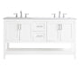 The nonchalant attitude of this 60" traditional white finish vanity will have you wanting more. The slender brushed nickel handle bars open the two double cabinet doors and two center drawers to reveal ample storage space to put away and store bathroom essentials, and the open space below allows for you to place clean towels on the rack. Topped with a Calacatta engineered marble countertop and double porcelain undermount sink, you and your guests will enjoy this easy going vanity.