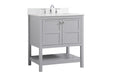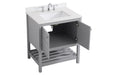 The subtle beauty of the Theo collection 30" vanity in a gray finish exudes comfortable luxury. Its modern, yet traditional beauty will surely dress up your bathroom or powder room without any fuss. The white stone countertop and porcelain undermount sink shows quiet opulence, and the legs support upright without fail. Brushed Nickel hardware complements the trendy gray finish, with pulls adorning the two cabinet doors, showcasing ample storage space within. Slated shelf allows for additional space to organize your towels. Whether this vanity is in your bathroom or for guests, its presence will surely elevate the aesthetics of your room. Comes with a matching backsplash to complete the look and protects your wall.