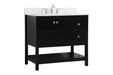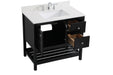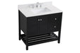 The subtle beauty of the Theo collection 36" vanity in a black finish exudes comfortable luxury. Its modern, yet traditional beauty will surely dress up your bathroom or powder room without any fuss. The white stone countertop and porcelain undermount sink shows quiet opulence, and the legs support upright without fail. Brushed Nickel hardware complements the trendy black finish, with pulls adorning the two cabinet doors and two drawers, showcasing ample storage space within. Slated shelf allows for additional space to organize your towels. Whether this vanity is in your bathroom or for guests, its presence will surely elevate the aesthetics of your room. Comes with a matching backsplash to complete the look and protects your wall.