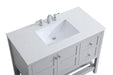 The subtle beauty of the Theo collection 42" vanity in a gray finish exudes comfortable luxury. Its modern, yet traditional beauty will surely dress up your bathroom or powder room without any fuss. The white stone countertop and porcelain undermount sink shows quiet opulence, and the legs support upright without fail. Brushed Nickel hardware complements the trendy gray finish, with pulls adorning the two cabinet doors and two drawers, showcasing ample storage space within. Slated shelf allows for additional space to organize your towels. Whether this vanity is in your bathroom or for guests, its presence will surely elevate the aesthetics of your room.