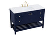 The subtle beauty of the Theo collection 48" vanity in a blue finish exudes comfortable luxury. Its modern, yet traditional beauty will surely dress up your bathroom or powder room without any fuss. The white stone countertop and porcelain undermount sink shows quiet opulence, and the legs support upright without fail. Gold hardware complements the trendy blue finish, with pulls adorning the two cabinet doors and four drawers, showcasing ample storage space within. Slated shelf allows for additional space to organize your towels. Whether this vanity is in your bathroom or for guests, its presence will surely elevate the aesthetics of your room.