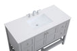 The subtle beauty of the Theo collection 48" vanity in a gray finish exudes comfortable luxury. Its modern, yet traditional beauty will surely dress up your bathroom or powder room without any fuss. The white stone countertop and porcelain undermount sink shows quiet opulence, and the legs support upright without fail. Brushed Nickel hardware complements the trendy gray finish, with pulls adorning the two cabinet doors and four drawers, showcasing ample storage space within. Slated shelf allows for additional space to organize your towels. Whether this vanity is in your bathroom or for guests, its presence will surely elevate the aesthetics of your room.