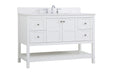The subtle beauty of the Theo collection 48" vanity in a white finish exudes comfortable luxury. Its modern, yet traditional beauty will surely dress up your bathroom or powder room without any fuss. The white stone countertop and porcelain undermount sink shows quiet opulence, and the legs support upright without fail. Brushed Nickel hardware complements the trendy white finish, with pulls adorning the two cabinet doors and four drawers, showcasing ample storage space within. Slated shelf allows for additional space to organize your towels. Whether this vanity is in your bathroom or for guests, its presence will surely elevate the aesthetics of your room. Comes with a matching backsplash to complete the look and protects your wall.