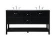 The subtle beauty of the Theo collection 60" vanity in a black finish exudes comfortable luxury. Its modern, yet traditional beauty will surely dress up your bathroom or powder room without any fuss. The white stone countertop and porcelain undermount sink shows quiet opulence, and the legs support upright without fail. Brushed Nickel hardware complements the trendy black finish, with pulls adorning the four cabinet doors and two drawers, showcasing ample storage space within. Slated shelf allows for additional space to organize your towels. Whether this vanity is in your bathroom or for guests, its presence will surely elevate the aesthetics of your room.