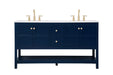The subtle beauty of the Theo collection 60" vanity in a blue finish exudes comfortable luxury. Its modern, yet traditional beauty will surely dress up your bathroom or powder room without any fuss. The white stone countertop and porcelain undermount sink shows quiet opulence, and the legs support upright without fail. Gold hardware complements the trendy blue finish, with pulls adorning the four cabinet doors and two drawers, showcasing ample storage space within. Slated shelf allows for additional space to organize your towels. Whether this vanity is in your bathroom or for guests, its presence will surely elevate the aesthetics of your room.