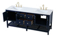 The subtle beauty of the Theo collection 72" vanity in a blue finish exudes comfortable luxury. Its modern, yet traditional beauty will surely dress up your bathroom or powder room without any fuss. The white stone countertop and porcelain undermount sink shows quiet opulence, and the legs support upright without fail. Gold hardware complements the trendy blue finish, with pulls adorning the four cabinet doors and four drawers, showcasing ample storage space within. Slated shelf allows for additional space to organize your towels. Whether this vanity is in your bathroom or for guests, its presence will surely elevate the aesthetics of your room.