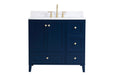 While unassuming, this 36" vanity in a Blue finish sure knows how to redefine luxury. The sleek gold knobs adorn the double cabinet doors and 3 drawers which allow you to store your bathroom toiletries and necessities. Standing strong on oblique legs and dressed with a Calacatta engineered marble countertop, this vanity will surely create beauty and casual elegance in your bathroom or powder room. Comes with a matching backsplash to complete the look and protects your wall.