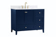 While unassuming, this 42" vanity in a Blue finish sure knows how to redefine luxury. The sleek gold knobs adorn the double cabinet doors and 3 drawers which allow you to store your bathroom toiletries and necessities. Standing strong on oblique legs and dressed with a Calacatta engineered marble countertop, this vanity will surely create beauty and casual elegance in your bathroom or powder room. Comes with a matching backsplash to complete the look and protects your wall.