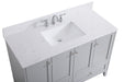 While unassuming, this 48" vanity in a grey finish sure knows how to redefine luxury. The sleek brushed nickel knobs adorn the 4 cabinet doors and 2 bottom drawers which allow you to store your bathroom toiletries and necessities. Standing strong on oblique legs and dressed with a Calacatta engineered marble countertop, this vanity will surely create beauty and casual elegance in your bathroom or powder room. Comes with a matching backsplash to complete the look and protects your wall.
