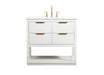 Live in modern comfort with this 36" white finish vanity. Dressed in a white and sleek gold metal hardware, its contemporary style will have your bathroom or powder room elevated in modern sophistication. The open shelf at the base and four drawers reveal ample storage space for your bathroom essentials and miscellany. Clean lines create its own visual interest, adding trendy looks to your already chic room.