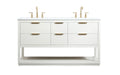 Live in modern comfort with this 60" white finish double vanity. Dressed in a white and sleek gold metal hardware, its contemporary style will have your bathroom or powder room elevated in modern sophistication. The open shelf at the base and five drawers reveal ample storage space for your bathroom essentials and miscellany. Clean lines create its own visual interest, adding trendy looks to your already chic room.