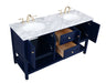 Create a refined and relaxing bath space with this contemporary design vanity, presenting its simplicity and clean straight lines in a minimalist appeal. This 60" freestanding vanity, crafted of solid poplar wood, provides ample storage within its double center drawers and 4 side doors, all equipped with soft closing mechanism and accentuated with gleaming gold hardware. Rounding out the design is a luxurious Itallian Carrara white marble countertop and double white porcelain under-mount oval sink.