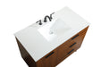 Modern sophistication is defined with the teak finish and black barpulls of this vanity and slender tapered legs. Its length makes it the perfect addition to any sized home, and saves space with its storage area hidden behind the Single cabinet door and two bottom drawers. Topped with a highly durable engineered stone countertop and a porcelain undermount sink, this modern design will become your focal point of your bathroom. Equipped with soft-closing drawer and doors adds a quiet functional touch.