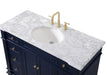 The Wesley Collection vanity cabinet will bring a settle pop of color into your bathroom. The navy blue is a cool color which creates a calming atmosphere in the room. The gold knobs bring a vibrant touch to balance the vanity. With the detailed engravings, the cabinet catches eyes with its beautiful lining work. Open the cabinet doors to store what you desire and make use of the spacious area. To top it off, the Carrara white marble adds a luxury and modern finish to the countertop.