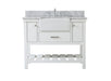 Make the most of your space with this farmhouse style bathroom vanity. Complements well with its beautiful finish, carrara white marble countertop, and the contemporary slender handle bar that sits on the functional drawers with soft closing mechanism, allowing you to store an assortment of bathroom essentials. The lower shelf makes it the perfect space to hold new towels for your guests. This stylish vanity ensures both form and function in your bathroom for you and your guests.