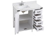 The Grant Collection 36 in. vanity is a practical and stylish upgrade for your bathroom. Its white finish is highlighted by the engineered white stone top featuring an under-counter rectangular sink. The cross patterned cabinet doors are decorated with bold black hinges and bar pulls. The cabinet has four pullout drawers, ideal for towels, washcloths and bath accessories Comes with a matching backsplash to complete the look and protects your wall.