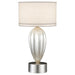 Table lamp in a platinized silver leaf finish with subtle brown highlights and white textured linen shade with pierced metal gallery in matching silver leaf finish.