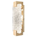 Indoor aluminum sconce features a three-dimensional contrast of deep textured and polished cast glass. This stunning landscape of the glass, illuminated by waterproof LEDs, is available in clear (shown) or highlighted with antiqued gold leaf. Choice of three finishes, champagne tinted gold leaf finish or silver leaf for indoor only, and a hand rubbed black iron for indoor and outdoor use.