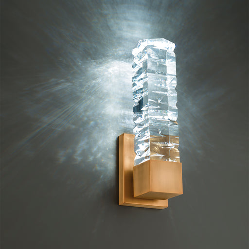 Asymmetrical elegance in lumosity. Double blocks of cloudy acrylic sandwich a metal bar. Artisan crafted for all orientations around your vanity in...