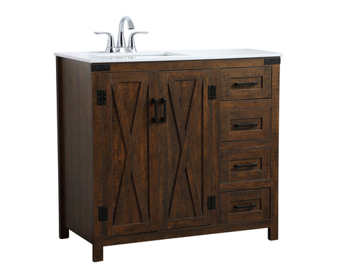 The 36" espresso finish vanity recalls a time of rustic nature. Reminiscent of barn doors, the 2 door cabinet and 4 drawers add both stylistic char...