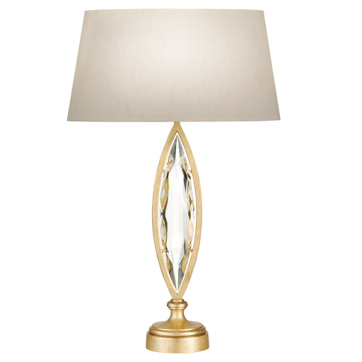Elegant and graceful table lamp in Florentine brushed gold leaf finish with hand cut faceted crystals. Marquise shaped laminated cream fabric shade...