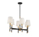 The Savoy House Brody 6-light linear chandelier is a great way to infuse your home with sophisticated lighting style. Its streamlined classic look is decorated with white fabric shades and finished in matte black with bold warm brass accents. It's perfect for brightening up any room! Brody is 41" in length and 18" in width. It has an adjustable height ranging from 24" to 70". It uses six candelabra size bulbs with a max of 60 watts per bulb. Comes with four 12" downrods and one 6" downrod, plus 80" of cord.