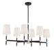 The Savoy House Brody 6-light linear chandelier is a great way to infuse your home with sophisticated lighting style. Its streamlined classic look is decorated with white fabric shades and finished in matte black with shining polished nickel accents. It's perfect for brightening up any room! Brody is 41" in length and 18" in width. It has an adjustable height ranging from 24" to 70". It uses six candelabra size bulbs with a max of 60 watts per bulb. Comes with four 12" downrods and one 6" downrod, plus 80" of cord.