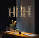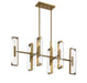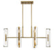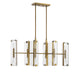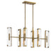 Sleek and sophisticated! The Savoy House Winfield 12-light linear chandelier has an eye-catching design, yet the clean lines and transparent glass keep the mood serene. Bold straight lines of the downrod, frame and bulb sockets are highlighted by a warm brass finish. Each of the six light arms holds two 60W candelabra size bulbs, one facing up and one facing down, for splendid illumination through the pristine clear glass shades. This linear chandelier measures 38" long and 17.25" high. With included 30 degree swivel and extension rods, it has an up to 69.25" hanging height and accommodates sloped ceilings. Overall, it's a chic and stylish fixture for your dining room, living room, entryway, kitchen island, family room, bar, office or media room.
