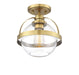 This Savoy House Pendleton 1-light ceiling semi-flush mount is a smart way to pep up the illumination and style in any room, including small spaces that might otherwise have lackluster light. It showcases a large orb of clear glass that is open at the bottom, allowing for more direct light and making it easy to replace the bulb. Metal bands bisect the shade and help hold it to the fixture's base. Try using this fixture in laundry rooms, closets, hallways or entryways, though truly the possibilities are endless. Finished in warm brass. This fixture is 9.38" wide and 9.75" tall. Uses a standard size bulb of up to 60 watts (not included).