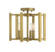 A simple cage with modern flair defines the Benson collection. This universally flattering three-light semi-flush mount in a warm brass finish measures 12" high x 13" wide. It provides ample illumination from three 60-watt candelabra bulbs.
