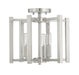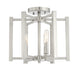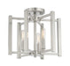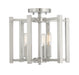 A simple cage with modern flair defines the Benson Collection. This universally flattering three-light semi-flush mount in a satin nickel finish measures 12" high x 13" wide. It provides ample illumination from three 60-watt candelabra bulbs.