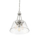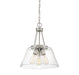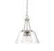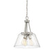 The Calhoun collection is distinguished by simple lines that can easily enhance transitional and contemporary décor. Measuring 18" high x 15" wide, this three-light pendant offers a clean silhouette in a satin nickel finish and clear glass shades. It is illuminated by three 60-watt standard size bulbs.