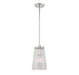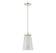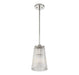 A textured, eye-catching shade of clear ribbed glass takes center stage in the Chantilly 1-light pendant from Savoy House. Finished in polished nickel. Chantilly is 8" in diameter and it has an adjustable height ranging from 22.5" to 41.5". It uses one standard size bulb with a max of 60 watts. Comes with three 9.5" downrods, plus 120" of cord.