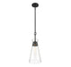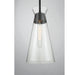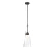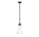 A conical shade of clear glass recalls Italian midcentury modern lighting designs in the stylish Lakewood 1-light mini pendant from Savoy House. The fixture is finished in bold matte black. Lakewood is 8" in diameter and has an adjustable height ranging from 31.5" to 50.5". It uses one standard size bulb with a max of 60 watts. Comes with three 9.5" downrods and 120" of cord.