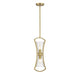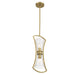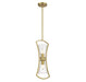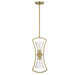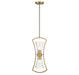 This Savoy House Bennington 2-light pendant features pleasantly curving shapes that combine to create an intriguing lighting look. Fluted clear glass shades and thoughtful detailing on the structure, finished in warm brass, gives the impression of motion. Bennington is 8.75" in width and has an adjustable height ranging from 22.5" to 76". Comes with four 12" downrods and one 6" downrod. Uses two candelabra size bulbs of up to 60 watts per bulb (bulbs not included).