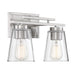 Brighten up your bath with the sleek and contemporary look of the Calhoun. The fixture's frame has a rectangular wall plate, bold-lined light bar and chunky cylindrical bulb sockets, all in a satin nickel finish. The tapered cone shades are made of pristine, clear glass. Altogether, it has a stylish, clean and neutral appearance that blends well with other hardware in your contemporary, modern, bohemian or transitional decor. Two 60W standard size bulbs provide plenty of illumination above the vanity. This Calhoun bath bar is 14.58" wide, 8.75" high, and extends 6.38" from the wall. Plus, it may be mounted as either uplight or downlight, making a superb and stylish choice for your bathroom or powder room.