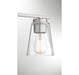 Brighten up your bath with the sleek and contemporary look of the Calhoun. The fixture's frame has a rectangular wall plate, bold-lined light bar and chunky cylindrical bulb sockets, all in a satin nickel finish. The tapered cone shades are made of pristine, clear glass. Altogether, it has a stylish, clean and neutral appearance that blends well with other hardware in your contemporary, modern, bohemian or transitional decor. Four 60W standard size bulbs provide plenty of illumination above the vanity. This Calhoun bath bar is 32" wide, 8.75" high, and extends 6.38" from the wall. Plus, it may be mounted as either uplight or downlight, making a superb and stylish choice for your bathroom or powder room.