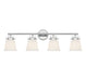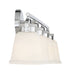 The Kaden 4-light bathroom vanity light from Savoy House has a classic look with a hint of industrial inspiration. White opal glass shades are held in place with eye-catching hardware that, like the bar and backplate, is finished in polished chrome. Kaden is 10.5" in height, 34" in width and extends 7" from the wall. It uses four standard size bulbs with a max of 60 watts per bulb. Damp area rated.