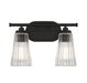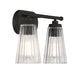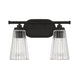 Textured, eye-catching shades of clear ribbed glass take center stage in the Chantilly 2-light bathroom vanity light from Savoy House. Finished in matte black. Chantilly is 10" in height, 14" in width and extends 7" from the wall. Uses two standard size bulbs of up to 60 watts per bulb. Damp area rated.