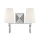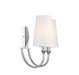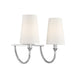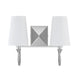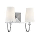 Bring the understated, classic beauty of the Savoy House Cameron 2-light bath bar into your home to create a thoughtful accent in any bathroom. This vanity light features slender, dramatically-curving arms topped with tall, tapered white fabric shades, ensuring a flattering glow. The faceted backplate adds another dimension of style, too. Finished in polished nickel. This fixture is 15" wide and 12" tall. It extends 8" from the wall. Uses 2 candelabra size bulbs of up to 40 watts each (not included).