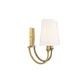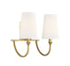 Bring the understated, classic beauty of the Savoy House Cameron 2-light bath bar into your home to create a thoughtful accent in any bathroom. This vanity light features slender, dramatically-curving arms topped with tall, tapered white fabric shades, ensuring a flattering glow. The faceted backplate adds another dimension of style, too. Finished in warm brass. This fixture is 15" wide and 12" tall. It extends 8" from the wall. Uses 2 candelabra size bulbs of up to 40 watts each (not included).