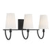 Bring the understated, classic beauty of the Savoy House Cameron 3-light bath bar into your home to create a thoughtful accent in any bathroom. This vanity light features slender, dramatically-curving arms topped with tall, tapered white fabric shades, ensuring a flattering glow. The faceted backplate adds another dimension of style, too. Finished in matte black. This fixture is 24" wide and 12" tall. It extends 8" from the wall. Uses 3 candelabra size bulbs of up to 40 watts each (not included).