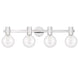 This Savoy House Wright 4-light bath vanity light showcases streamlined style that makes it ideal for any bathroom. Round clear glass shades add an extra dimension and extra protection for the light bulbs within. Chrome finish. Wright is 34" in width, 10" in height and extends 7.5" from the wall. Uses 4 standard size bulbs of up to 60 watts per bulb (bulbs not included). We recommend using tubular shaped bulbs.